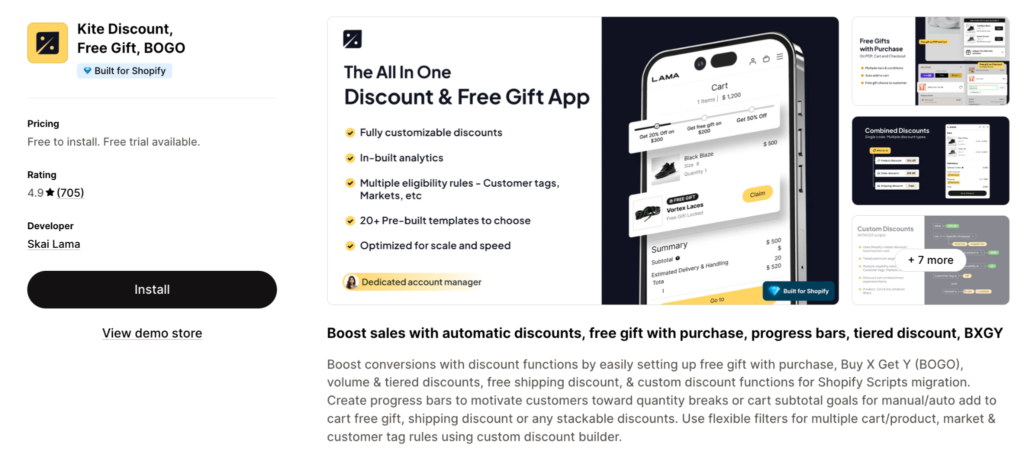 Kite Discount, Free Gift, BOGO sits between a simple gift tool and a full-scale promotion suite. It supports free gift with purchase, BOGO, tiered discounts, quantity discounts, free shipping bars, and combined discount logic, making it a strong option for stores that want more flexibility without moving to a heavier platform. For merchants who care about cart goals and discount functions, Kite offers a well-balanced feature set for the price.